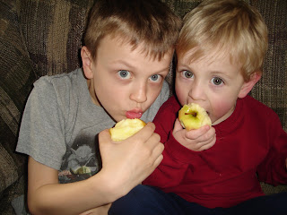 And here's another thing Jake's into: Apples. He says it with Z's instead of P's, but he eats them clear down to the core - like scary close to eating the seeds, which I hear are poisonous. It's especially cute because that dude rarely eats all of anything.
